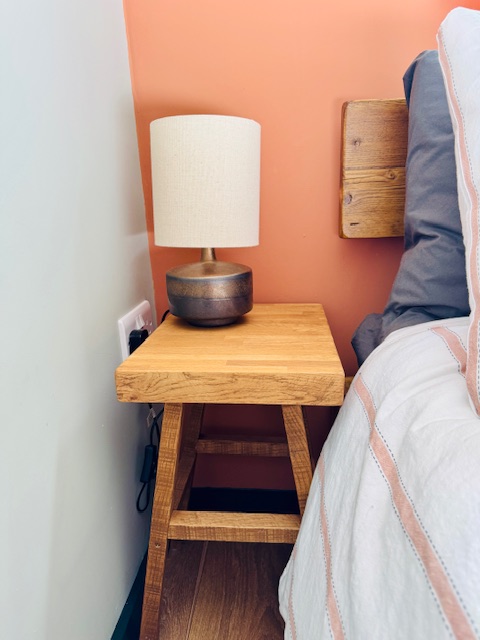 Bedroom: Hand-crafted king-size bed, quality Egyptian cotton and linen/cotton blend bedding, ample storage.